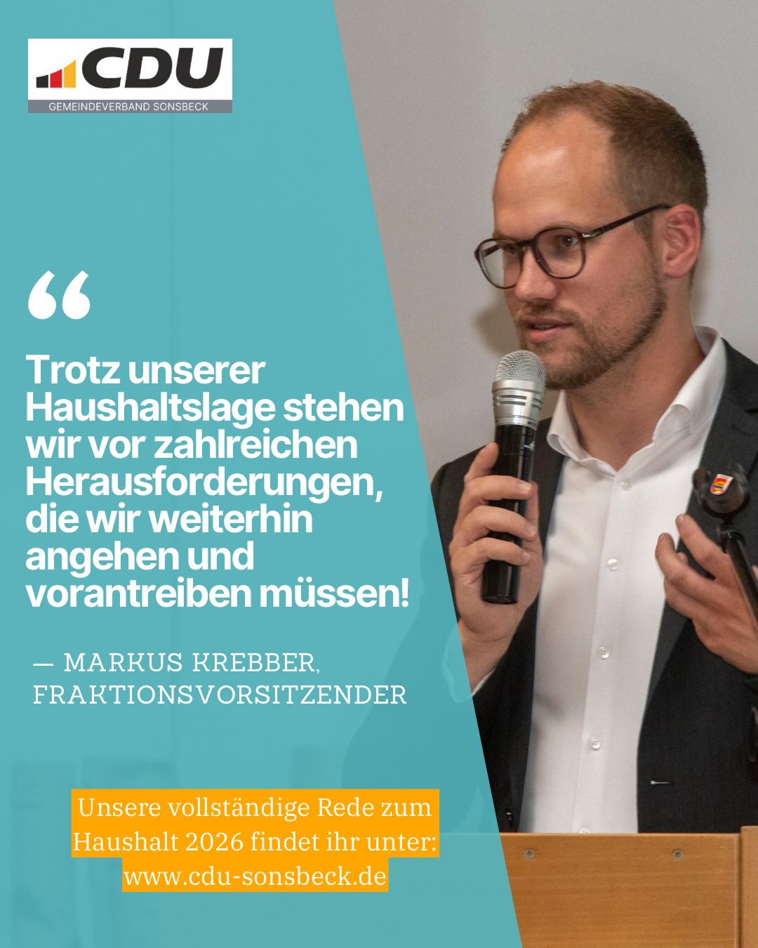 In der gestrigen Ratssitzung wurde der Haushalt 2026 verabschiedet ? mit nur einer Gegenstimme aus der Opposition 💼 Ein starkes Signal: Die Anliegen aus unseren Anträgen wurden einstimmig unterstützt 🤝✅ Damit setzen wir wichtige Impulse und treiben die Gestaltung und Weiterentwicklung von Sonsbeck, Labbeck und Hamb aktiv voran 🏡🚀 In seiner Haushaltsrede betonte Fraktionsvorsitzender Markus Krebber vor allem eines: Trotz schwieriger finanzieller Rahmenbedingungen braucht es eine solide Planung und gezielte Investitionen, um unsere Gemeinde Schritt für Schritt weiterzuentwickeln.📶 Die ganze Rede könnt ihr auf unserer Internetseite nachlesen 📄👍 #sonsbeck #haushalt2026 #ratssitzung #heimatgestalten